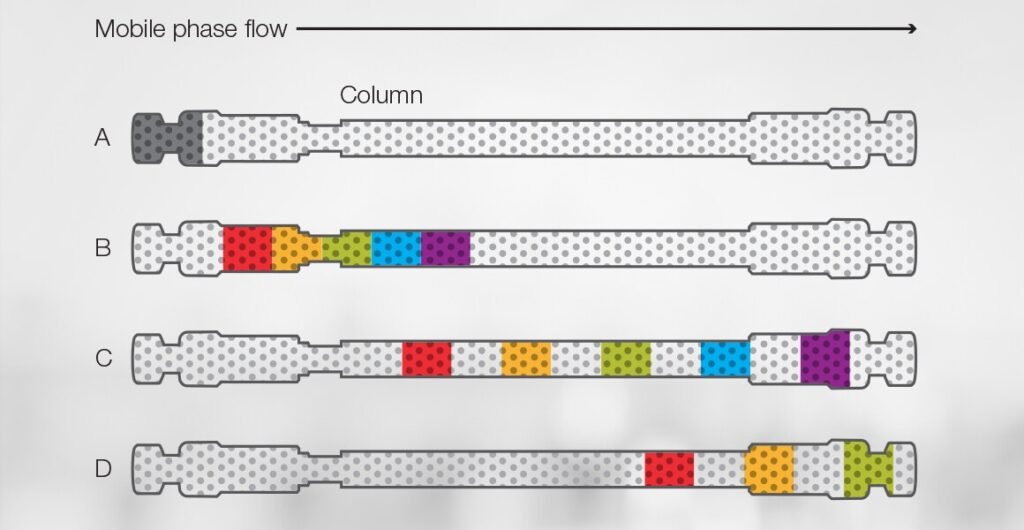 As the mixture flows through the column with the mobile phase, the red component (B) is more retained than the purple component. Therefore, the purple and blue components move through the column faster and are the first two “bands” to elute from the column (C). The green, yellow, and red bands are retained longer and elute later (D).